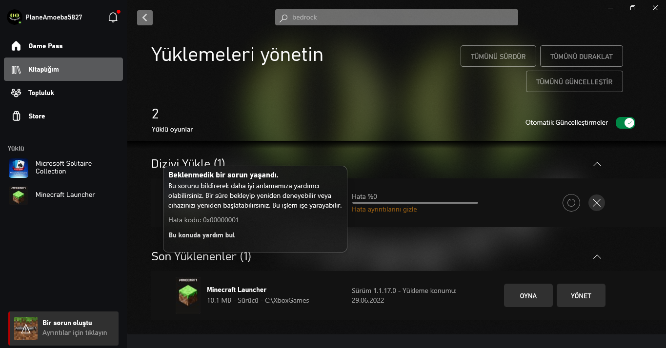 Minecraft Bedrock indirirken "0x00000001" hatası