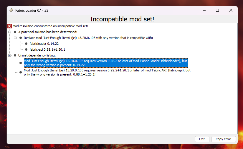 Merhaba herkese, CurseForge'dan modu açarken böyle hata alıyorum Fabric ve Fabric API kurulu olmasına rağmen. Sürüm ise Mod'la birlikte aynı.