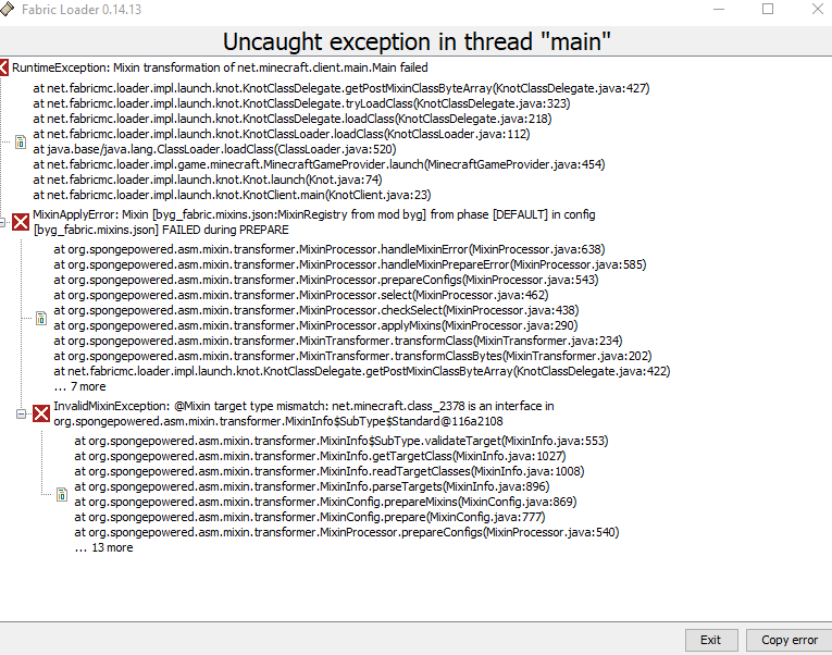 Minecraft fabric (uncaught expection in thread "main") hatası alıyorum sorunun çözümü için yardımcı olabilir misiniz?