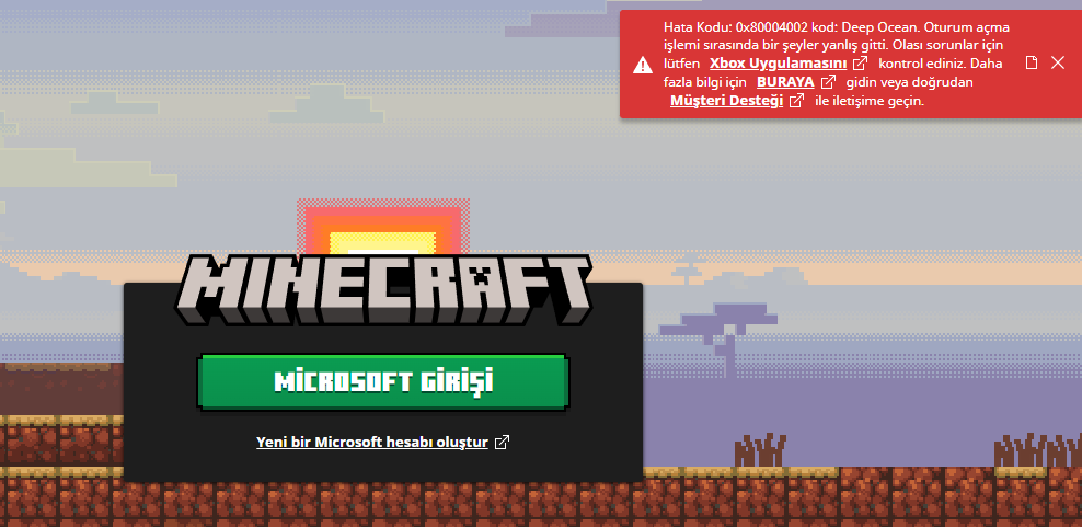 Merhaba ben Minecraft satın aldım ve Minecraft Launcher'dan Microsoft girişi dediğim zaman "hata kodu: 0x80004002 kod: Deep ocean. Oturum açma işlemi sırasında bir şeyler yanlış gitti" diyor. Forumda diğer açılan konulara baktım ve elimden geleni yaptım ama sonuç nafile ne yapmam gerektiğini ve oyunu nasıl açabileceğimi söylerseniz mutlu olurum.