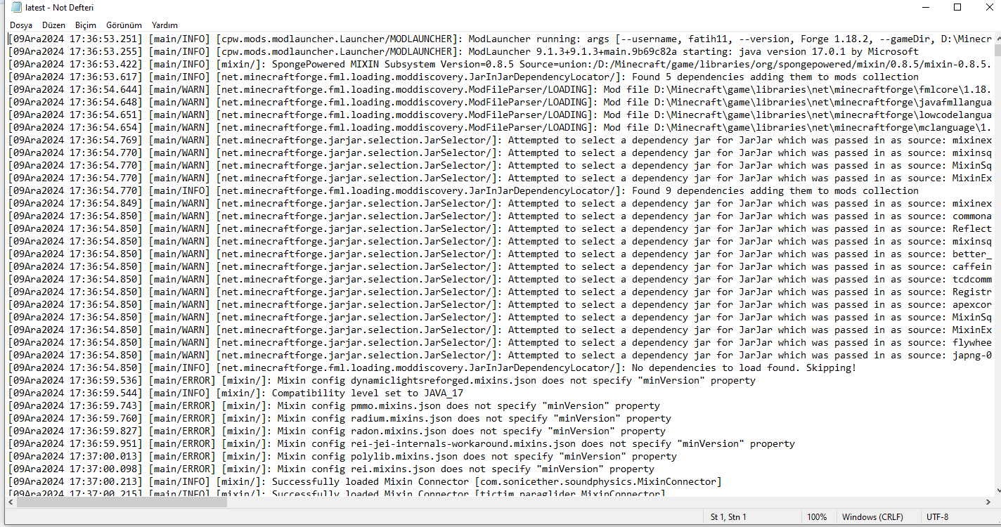 Bazı mixin hataları bulunuyor. Loglarda "Mixin config does not specify 'minVersion' property" hatası gözüküyor. Bu hata, belirli mixin yapılandırma dosyalarının minimum sürüm özelliğini belirtmediği anlamına gelir. Bu hata genelde modların eski sürümde olmasından kaynaklanır. Şu modların güncel sürümlerini indirmeyi dene: dynamiclightsreforged, promod.mixins, radium.mixins, rei-jei-interactions, workaround.mixins, polylib.mixins, rei.mixins. Bu modlarda gözüküyor bu sorun.Reis ona nereden bakabilirim?