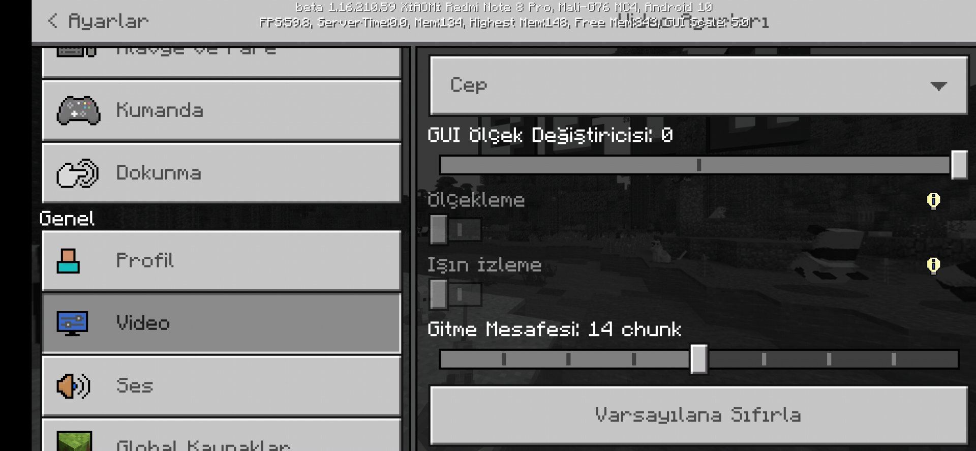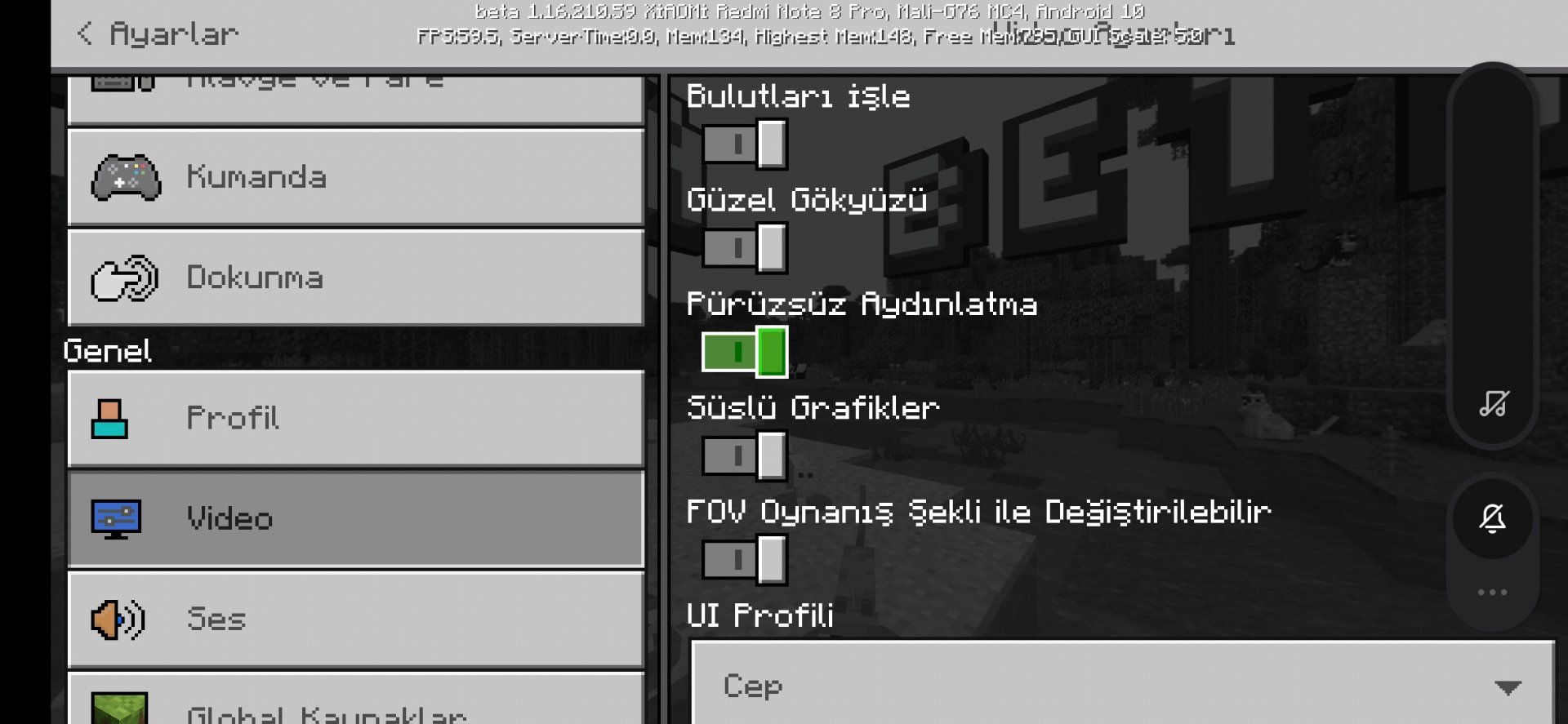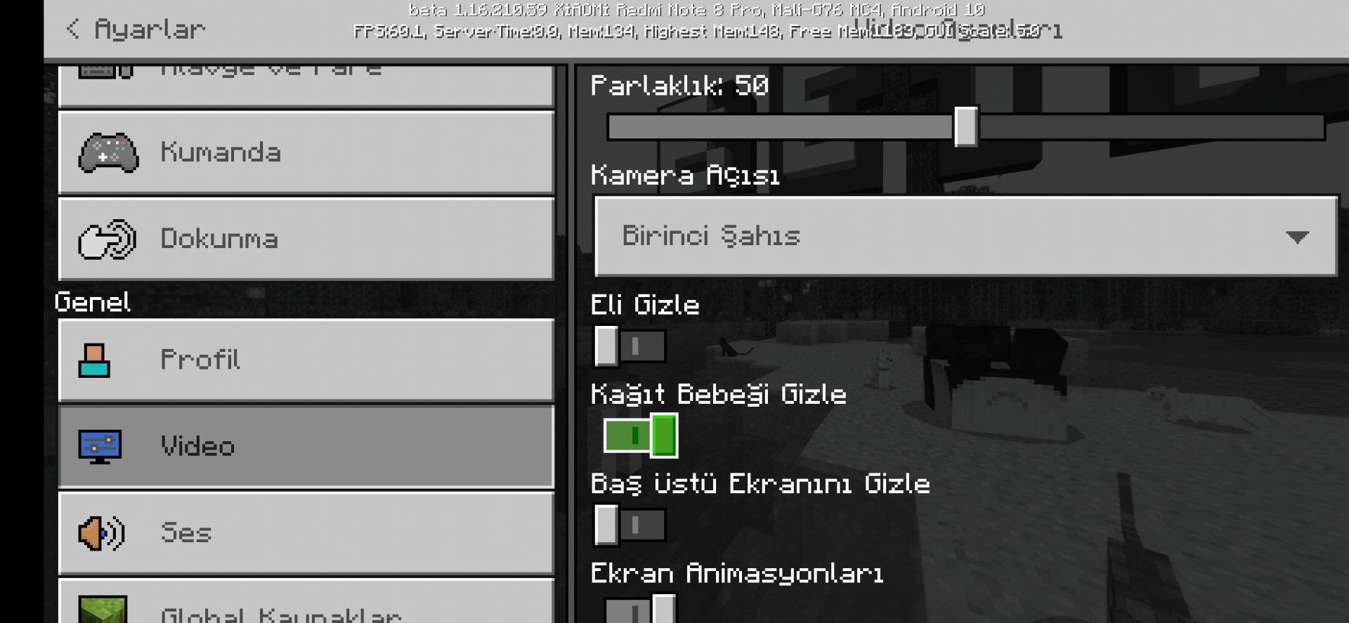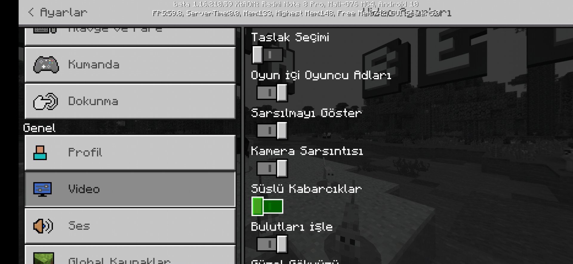 Kardeş şunu istiyor sizin ki Minecraft pe yüklü mü? Eğer yüklüyse tüm dokunma ayarlarını ve video ayarlarını ekran görüntüsünü alıp foruma koy. Ben yapamıyorum çünkü bende ayarlarını nasıl düzenleyeceğimi bilmiyorum.