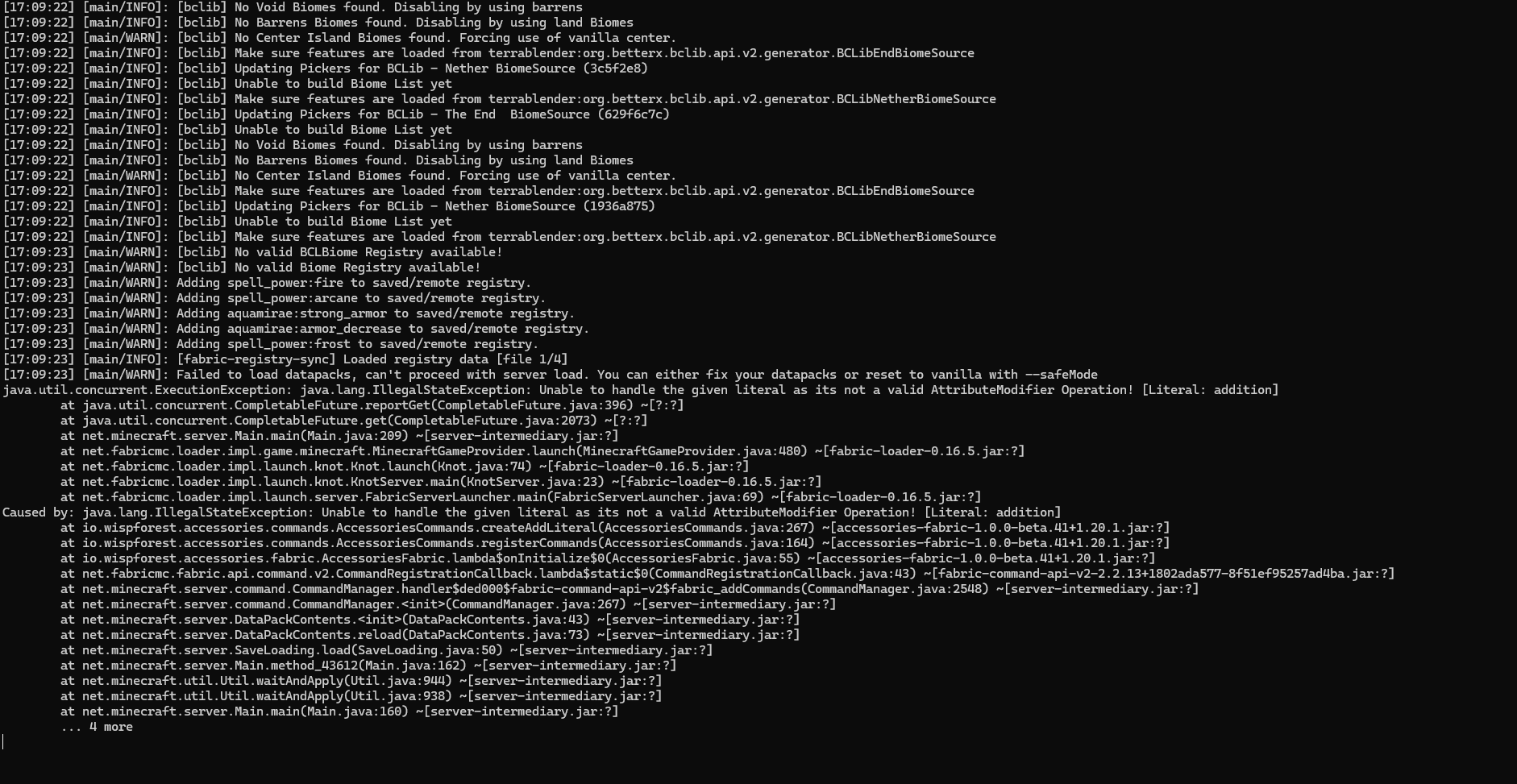 Sorun sanırım accessories modunuzdan kaynaklanıyor. Ayrıca en başta da dediği gibi sunucunuzun baslat.bat dosyasında ya da baslat. Sh fark etmez oraya yazdığınız yazının en sonuna ("Java -xms1g -xmx6g -jar paper-1.21.1-131.jar --nogui" tarzı bir yazı olur) --safemode eklerseniz datapacklerin düzelebileceği yazıyor (sanırım sorunlu olanları kapatıyor). Ayrıca, sorun modun oynadığınız oyun sürümüyle uyuşmamasından dolayı da kaynaklanıyor olabilir, eğer öyleyse güncel sürümle değiştirdiğinizde sorun çözülür diye düşünüyorum.