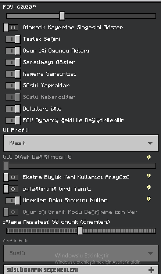 Bu da o dünyanın içerisindeyken video ayarları. Senin attığın ayarda grafik modunun altındaki seçeneğe tıklayabiliyorken ben tıklayamıyorum sadece tek mod var o da süslü ve tıklanmasına izin vermiyor ve senin attığın ekran görüntüsünde "oyun içi grafik modu değişimine izin ver" seçeneği sende aktif ama ben onu aktif edemiyorum.