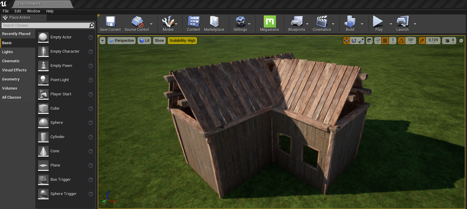 -İkinci olarak basit düzeyde modelleme öğrenmeniz çok yararlı olacaktır. Blender bunun için ideal bir program, blockout modelleme ve iyi texturelar ile profesyoneller kadar olmasada güzel sahneler yapmak mümkün. Şöyle blockout modellediğim ve texturelar için Megascans kütüphanesinden faydalandığım basit bir kulübe modeli atayım.