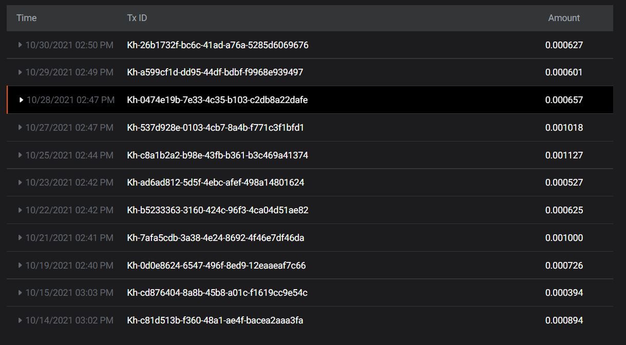 Son 2 haftalık ödemelerim. ETH cinsinden.