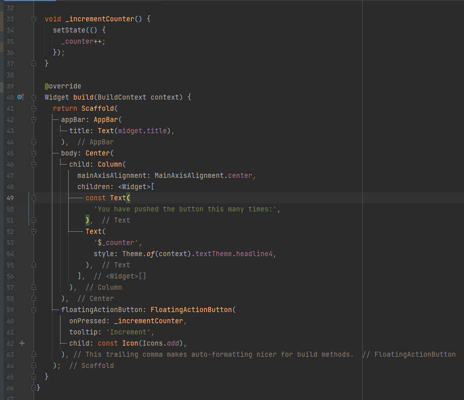 Örneğin buradaki AppBar, Text bunlar birer sınıftır. Bu Dart diliyle yazılıyor. Tasarımı Dart dili yazarak yapıyorsun. AppBar, Text sınıfları da StatelessWidget'ı extend ediyor o da Widget sınıfını extend ediyor. Her şey Widget derken bunu kastediyorlar.