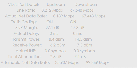 Altyapı sorguladığımda max 81 Mbps diyor.Modeminize yaklaşık 67 Mb/s indirme ve 8Mb/s yükleme hızı geliyor. SNR değerleriniz gayet iyi ve hattınıza maksimum 99 Mb/s hız tanımlanabilir gözüküyor. Hangi firmayı kullanıyorsanız tanımlanan hızın düşük olduğunu belirtin düzeltsinler