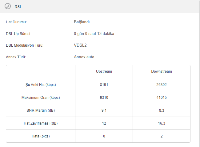Modem arayüzünden hat değerleriniz nasıl, ne kadar hız alabilirim gibi kendinizce yorumlar yapmanızı sağlayabilirsiniz.