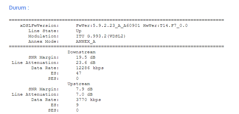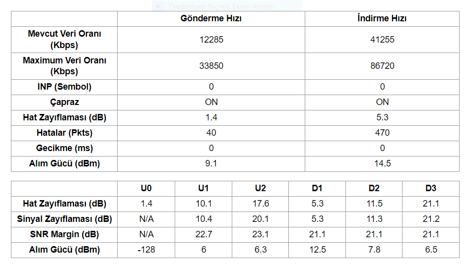 Not: ADSL kullanıyorsanız ADSL değerler için, VDSL kullanıyorsanız VDSL için değerlerdir. Kullanmadığınız bir yapının değerleri size ulaşmaz.