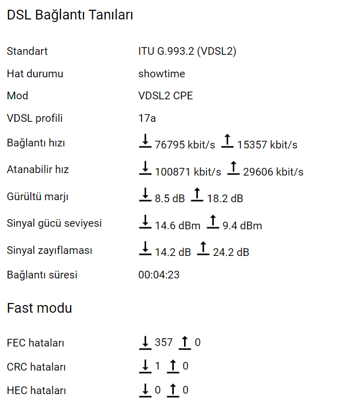 Not: ADSL kullanıyorsanız ADSL değerler için, VDSL kullanıyorsanız VDSL için değerlerdir. Kullanmadığınız bir yapının değerleri size ulaşmaz.