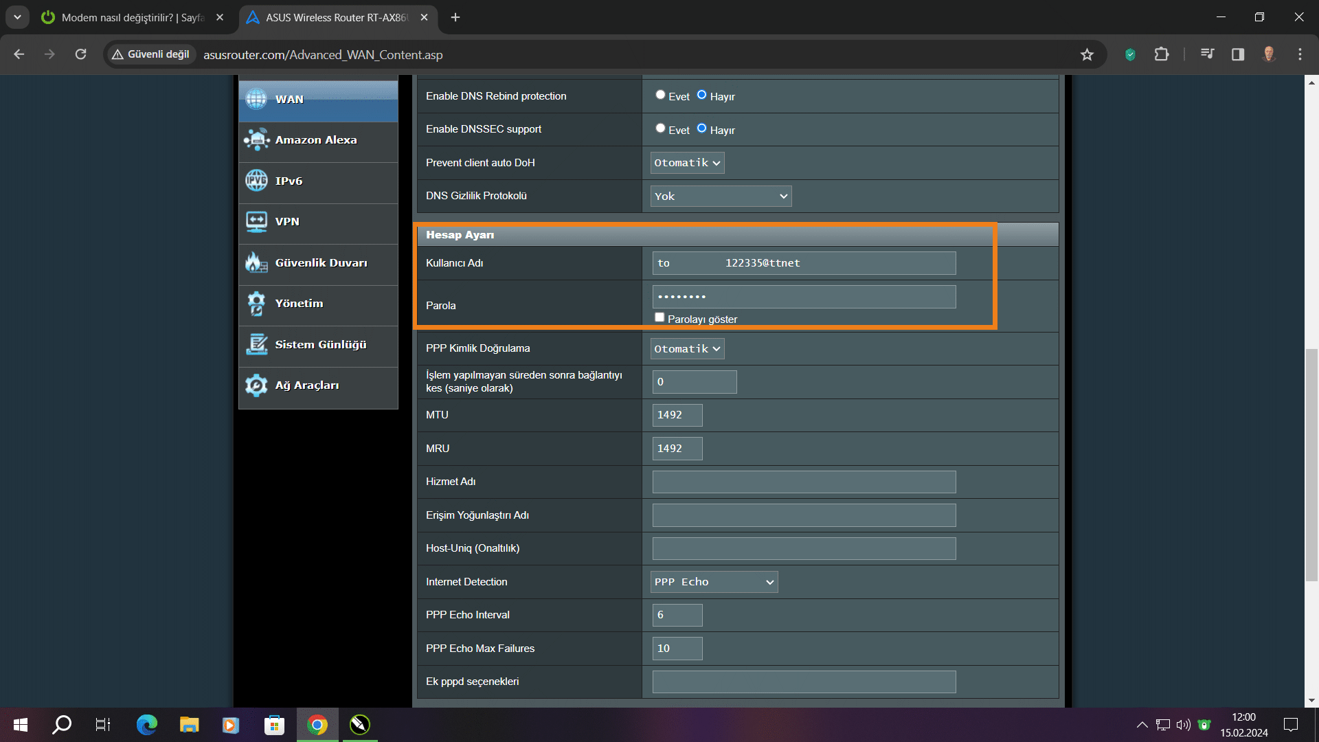 2. Adım: Hesap ayarı bölümünde Türk Telekom'un size verdiği PPPoE Kullanıcı adı ve şifreyi buraya yazın. Diğer değerler bendekiyle aynı olacaktır oralara ellemenize gerek yoktur, MTU/MRU, PPP Echo ayarları falan. Değilse de bendekiyle aynı değerleri yazın.