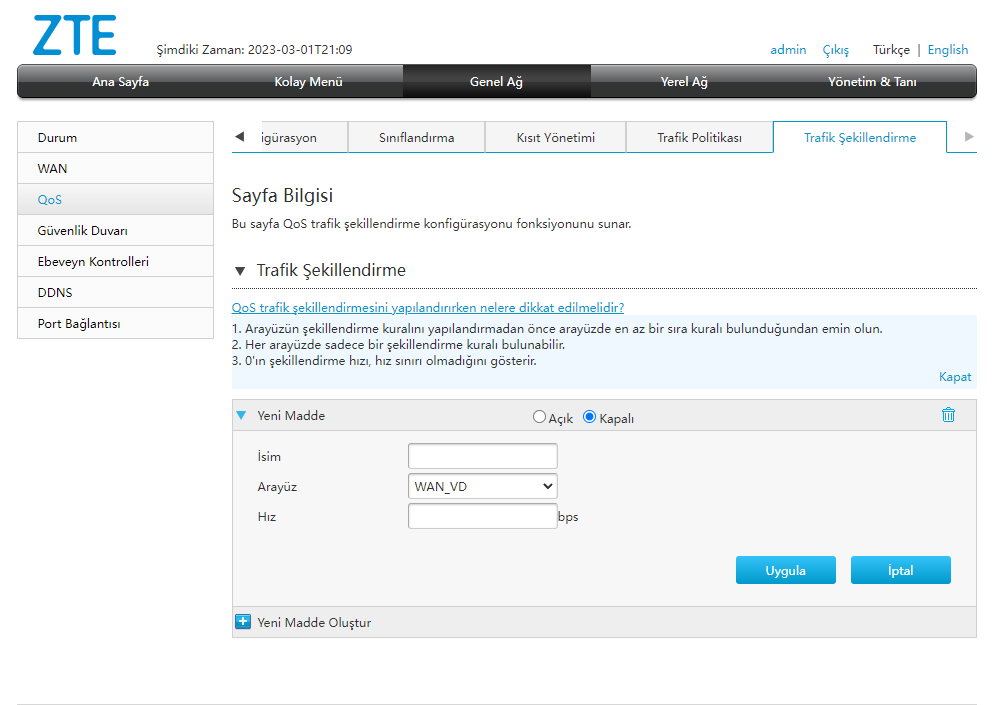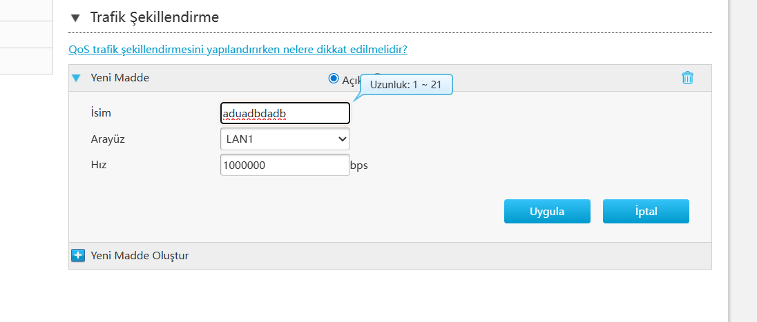 Hocam QoS bolumune girin, QoS anahtarini acin ve fotograftaki kisma gelin. Oradaki kisimda baglandiginiz Ethernet portunun numarasini secin, oradan kisitlamak istediginiz kadar yazin yani, mesela 10 Mbps = 1000000Bps seklinde bps degerini yazin. Uyguladiktan sonra ekran goruntulerini gonderin kontrol edelim.