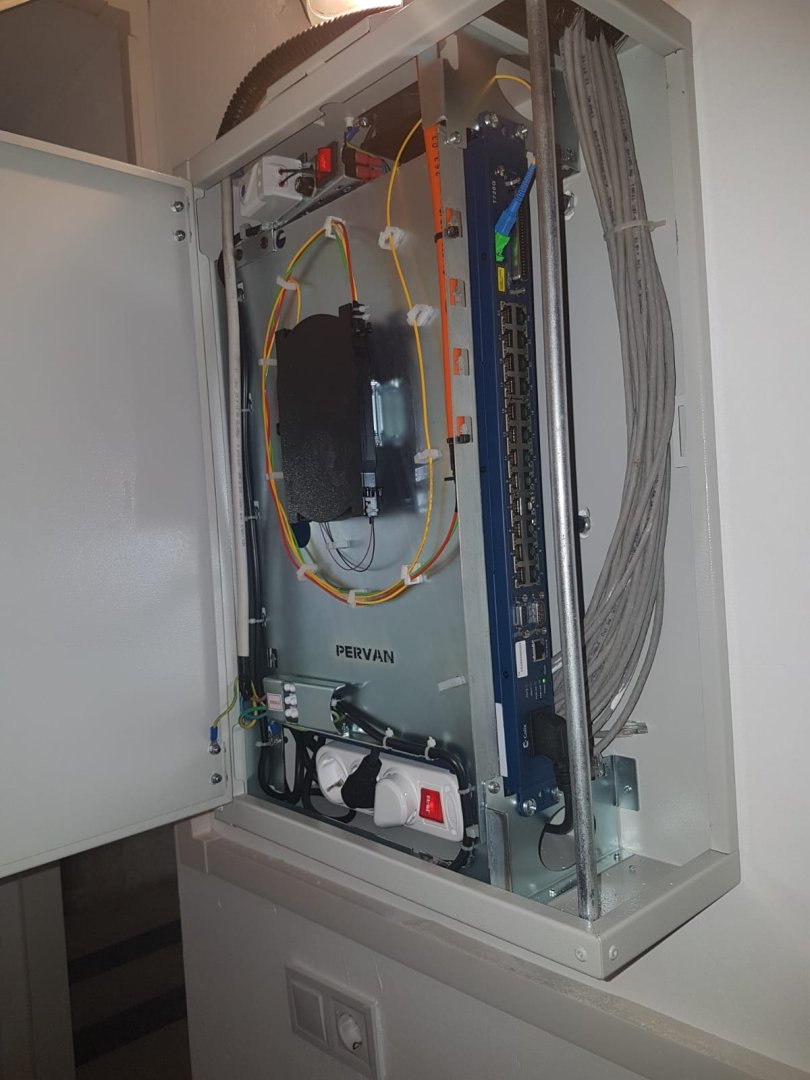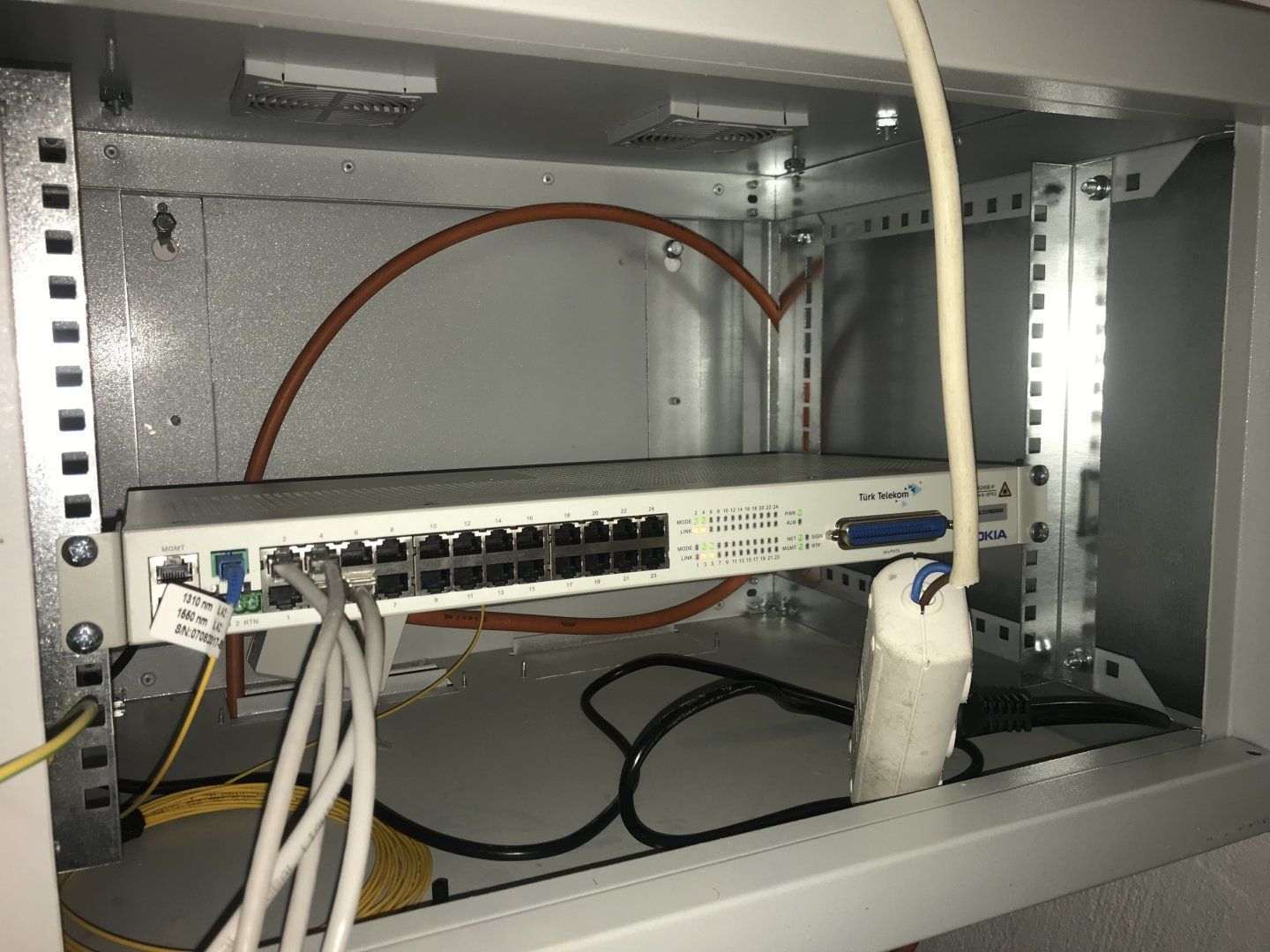Altyapınız FTTB-ETH dediğimiz tür. Yani fiberin binaya kadar geldiği ve dairelere de 8 telli bakır kablo dağıtıldığı sistem. Bu sistemde fiber kablo binaya kadar çekilir. Binada uygun bir konuma mdu (multi dwelling unit) cihazı yerleştirilir. Bu cihaz optik sinyali sfp (small form pluggable) modülü vasıtasıyla okur ve bakır kabloya (yani CAT kabloya) aktarır. Bu CAT kablolar da dairelere dağıtılır.
