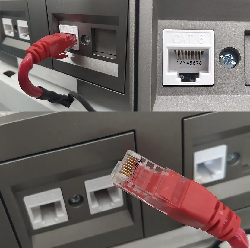 Bakın kablodaki her bir tel için rakam yazdım. Ayrıca prizdeki her bir tel için de rakam yazdım. Görüldüğü üzere hem kabloda hem prizde 8 adet tel var. Yani hem kablo hem de priz RJ-45 standardında olduğu için birbiriyle uyumlu vaziyetteler ve bu kablo bu prize rahatlıkla giriyor.