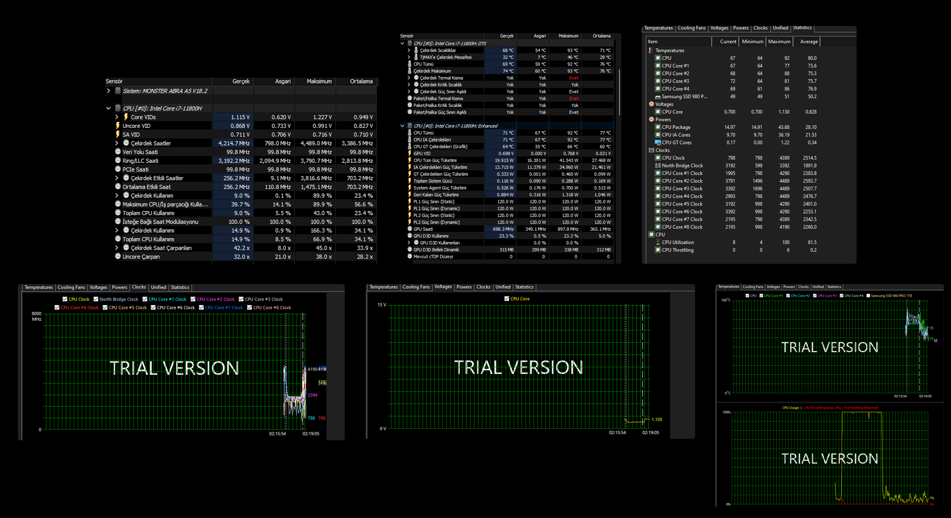 Bilgisayarımın modeli Monster Abra A5 18.2.1 ve işlemcim Intel 11800H. Oyun oynarken işlemci hızım 3,7 - 4 GHz arasında seyrederken bir süre sonra 2, 8'e kadar düşüp orada kalıyor, sonucunda performans kaybı yaşıyorum. Isıdan kaynaklı olabileceğini düşündüm, sonrasında Monster kontrol merkezinden çekirdek voltaj offset kısmını varsayılan 0'dan birer birer azaltarak -49 mv değerinde hız kaybını 2,8 yerine 3,1 civarlarında tutabildim. HWiNFO açıkken oyunda biraz vakit geçirip sonrasında hem voltaj offset ayarından önceki hem de sonrasında aldığım ekran görüntüleri ve yine aynı şekilde AIDA64 test sonuçları ekte. ThrottleStop vb. kullanmadan bu performans kaybını engelleyebilir miyim ya da nasıl minimuma indirebilirim ve pl değerlerini değiştirmemin bir faydası olur mu? Teşekkürler.