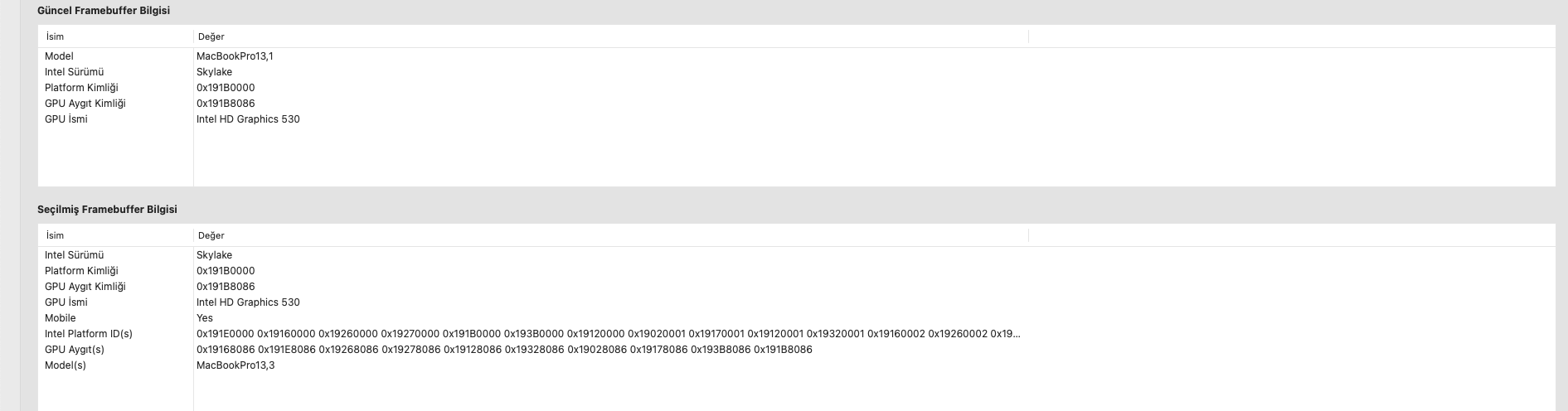 HDMI MacBook Pro 13,3 seçiliyken çalışmamaktaydı. O yüzden SMBus sürümünü 13,1 e çektim.