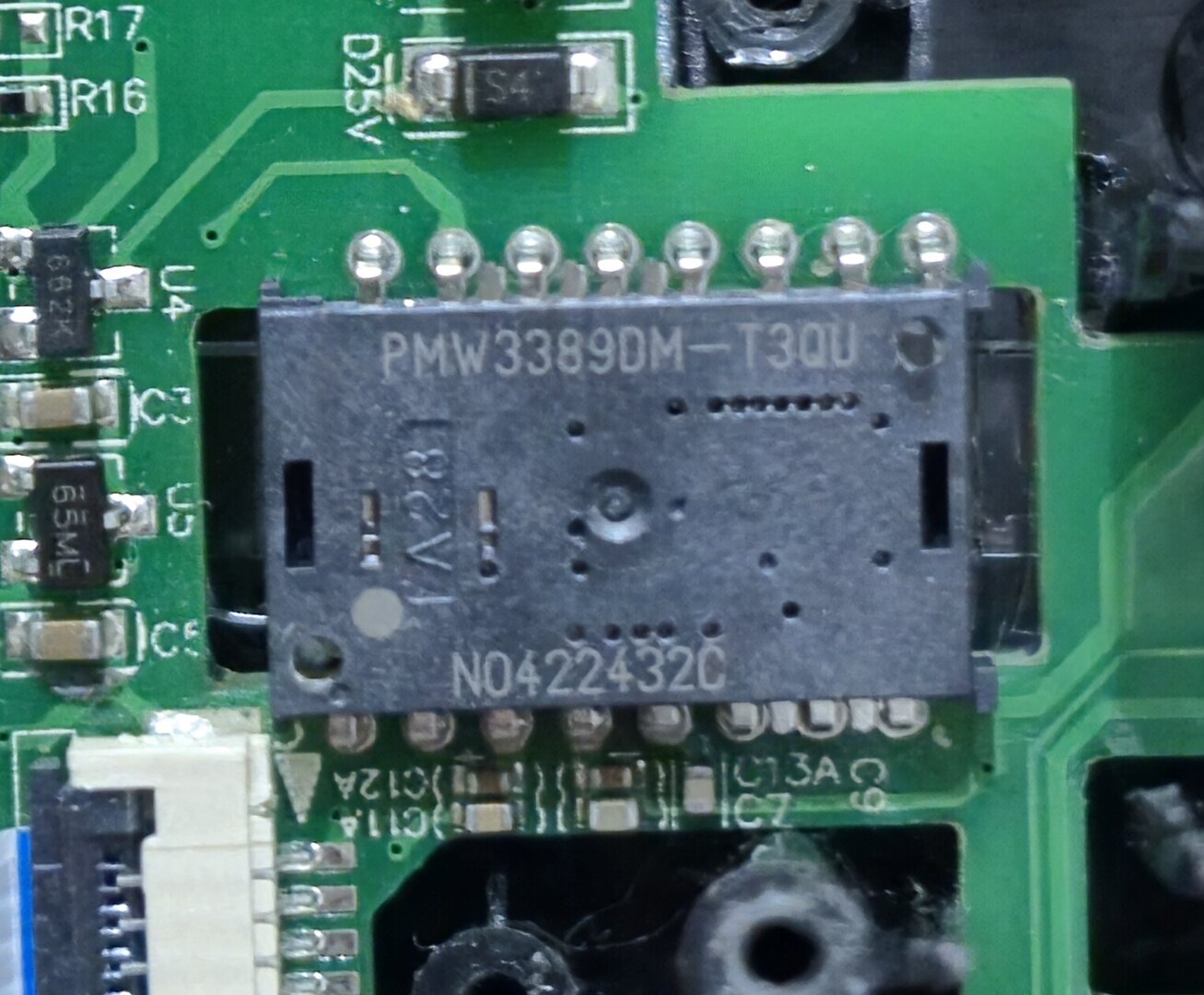 Sensöre baktığımızda ise sitede verilen PMW3389 bilgisinin dogru olduğunu görüyoruz. Günümüz için gayet yeterli bir sensör.
