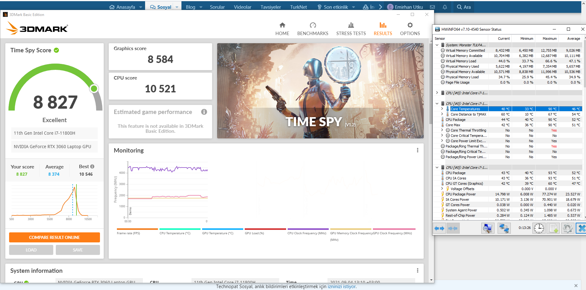 arkadaşlar time spy testi ve time spy sırasındaki sıcaklıklar hwinfo. Nasıl sizce termal throttling var gözüküyor ama @Radeon RX 5500M