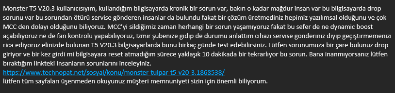 Arkadaşlar bugün Monster mağaza ve servisine gittim serviste çalışan arkadaş kayıt açıp ürünü bırakmanız lazım dedi mail ile gelen cevaptan farklı bir şey denmiyor, mağazada çalışan arkadaşla konuştum müşteri hizmetlerini arayabilirsin dedi, MCC geliştiricisi veya farklı bir kounşabileceğim yazılımcıları bulunmuyordu serviste ve mağazada.