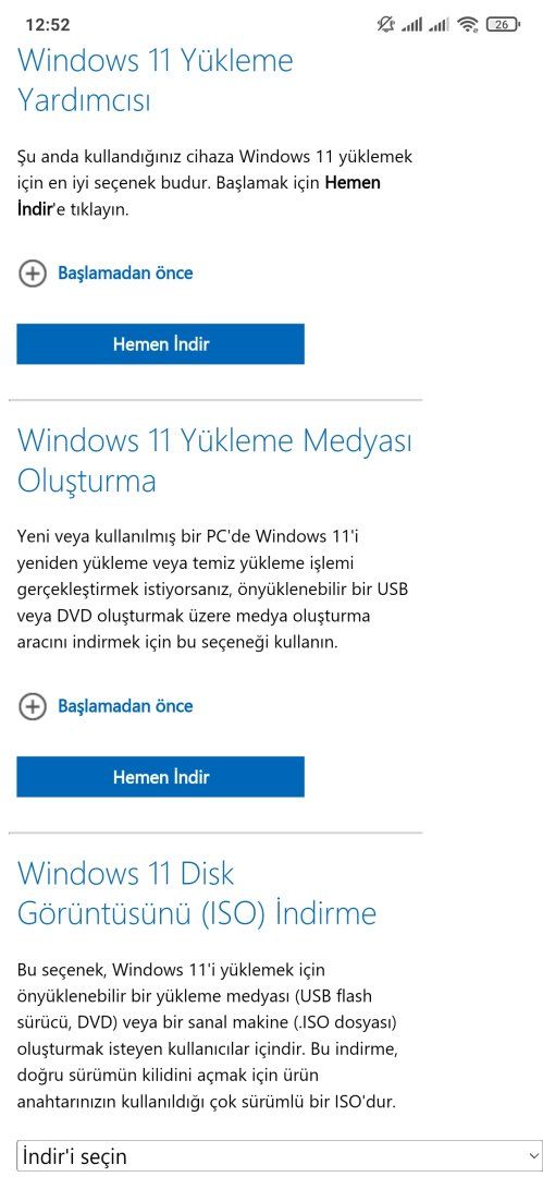 Eğer Rufus kullanmıyorsan ortadakini indirebilirsin. Creation tool ISO'yu indirip direkt olarak flasha yazdırır. Daha kolay bir işlem.