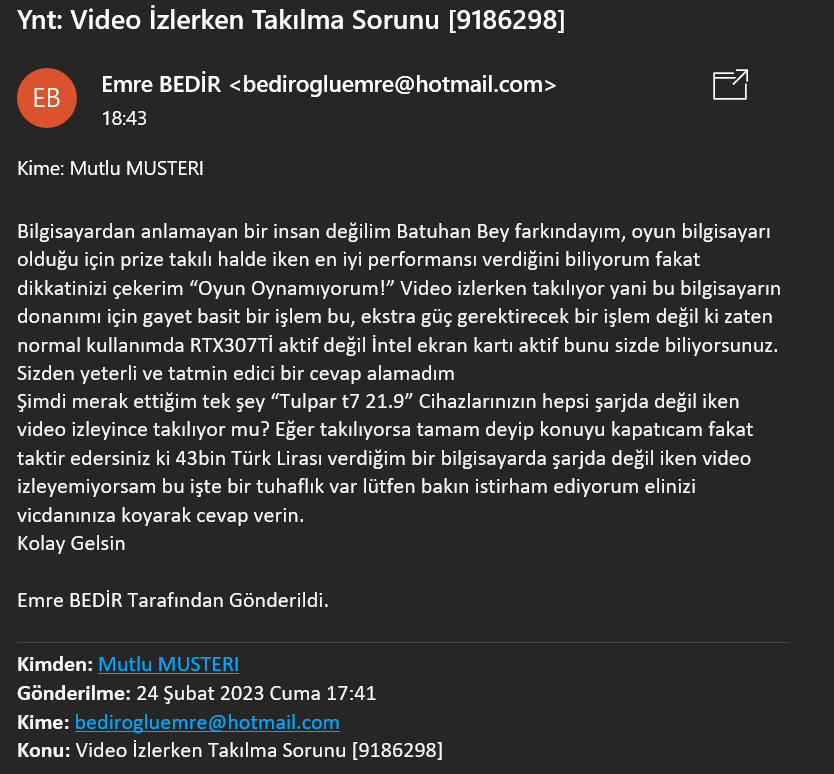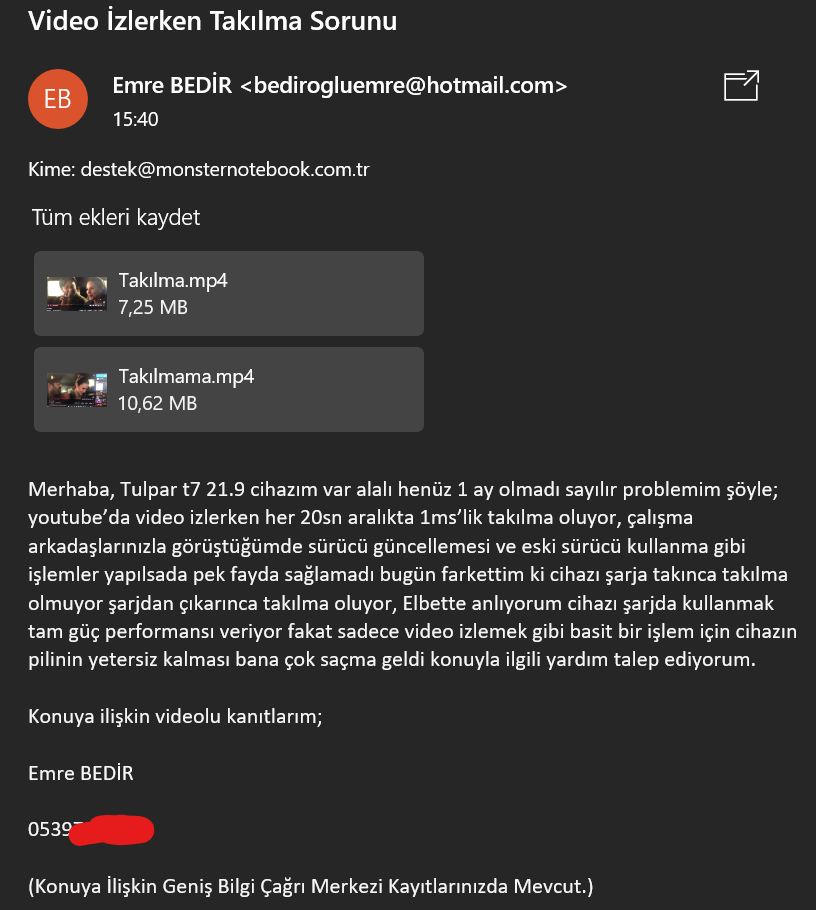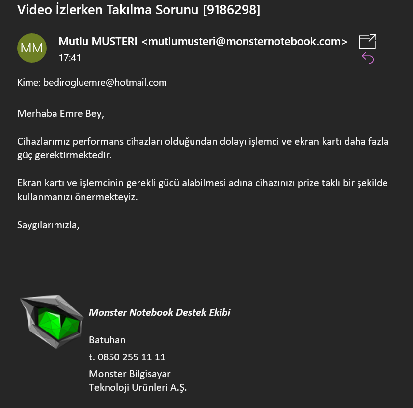 Herkese merhaba, elimde cihaz olarak Monster Tulpar T7 21.9 var alalı henüz 1 ay olmadı bile problemim şu şekilde, tarayıcıda bir video açıyorum izlerken her 20-25sn de bir 1Ms'lik görüntü takılması oluyor seste sıkıntı yok sadece görüntü anlık takılıyor ama göze batıyor. Bunun üzerine servisi aradım servis sürücüyü güncelleştirdi klasik işlemler yapıldı(bu arada cihazımda iki ekran kartı var birisi RTX 3070 Ti diğeri Intel'in ARC Xe falandı sanırım. PC günlük işlerde Intel'i kullanıyor bugün fark ettim cihazı şarja bağladığımda gayet sorunsuz izleyebiliyorum fakat şarjdan çıkardığımda takılma başlıyor. Bunu Monster destek ekibine ilettim görselde olduğu gibi saçma bir konuşma geçti aramızda neyse biraz önce DGPU'ya aldım cihazı sadece RTX3070 Ti ile bir bakayım dedim bu sefer de bir sıkıntı çıkmadan izledim sorun Intel'in neresinde çözemedim yazılım mı donanım mı? Veya ne yapmam lazım bilemiyorum Windows kaynaklı bir uyum sorunumu anlayamadım bu arada aklınıza gelen temel işlemleri yaptım önceden.
