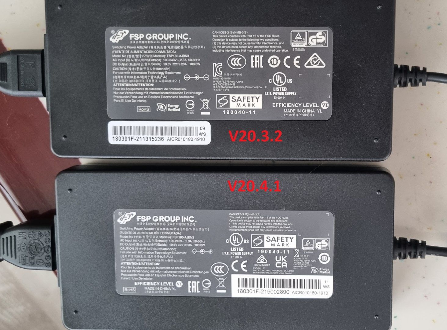 - Laptopların yanında gelen adaptörler ikisinde de FSP marka 180W adaptörler. Gelen adaptörler aynı güç değerine sahip olmasına rağmen yapılarında küçük farklar ve kablolarında farklar var.