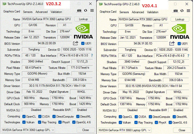 - Son olarak V20.4.1'de ekran kartı PCI-e 4.0 arayüzünden çalışmakta. V20.3.2'de ise PCI-e 3.0 arayüzünden çalışmakta. Arada ciddi bir fark oluşturmasa da yine de küçük farklılıklar var diyebiliriz.