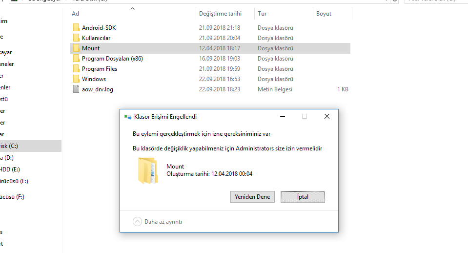 Windows PowerShell'i yönetici olarak aç sonraArkadaşlar geçenlerde bir klasör çarptı gözüme ve silmek istedim fakat başarısız oldum. İsmi "Mount".