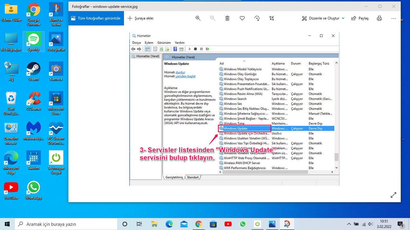 Hizmetler açıldıktan sonra 'Windows Update' buluyoruz.