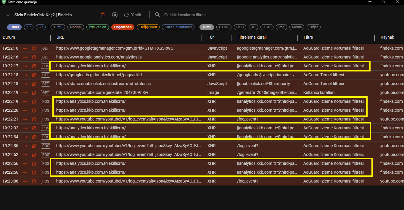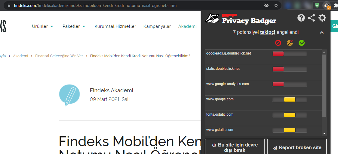 Yine başka bir örnek. findeks.com'a gidin ve Privacy Badger ile kontrol edin. Privacy Badger'ın göremediği izleyiciyi AdGuard engelleyebiliyor.