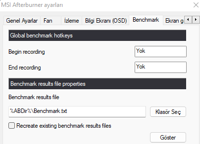 RTSS'den Setup'a basıp Enable Benchmark mode açabilirsiniz yada MSI Afterburner'dan kısayol atayıp Benchmark recordingini başlatabilirsiniz, buradan başlattığınız recording sonuçları bir TXT dosyasına da yazacaktır.