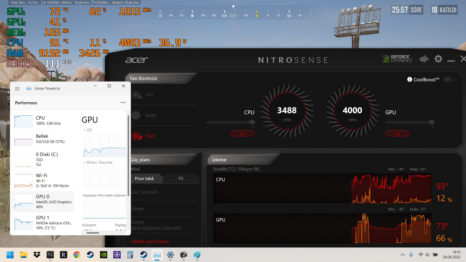 Arkadaşlar herkese kolay gelsin. Laptopum 1 yıllık. Servise göndererek toz bakımı, termal bakımları ve RAM taktırdım. Ayrıca serviste Windows 10 yükleyip bütün yazılımlarını kurmuşlar. PC'nin orijinal yazılımı olan Acer Nitro sense ve MSI Afterburner, görev yöneticisindeki GPU ve CPU kullanımları farklı. Önceden bu durum var mıydı bilmiyorum ama şu anda durum böyle. Termal bakımları yeni yapılmasına rağmen işlemci boşta 55-60 oyunda 90-95 derecelerde oluyor. Resimlerde PUBG ayarları 2 resimde en düşük ve 2 resimde ultradadır. Format atsam düzelir mi? Windows onarıcı vs bir şeyler yaptım ama hata bulamadı. Ne yapmam gerekir? Ustaları sahneye davet ediyorum