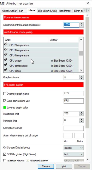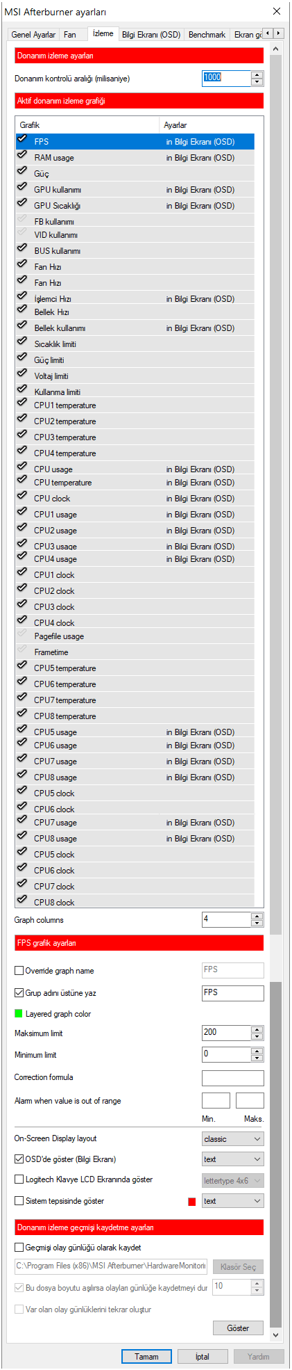 Resim her şeyi anlatsada kısa bir anlatayım. Afterburneri açtıktan sonra, ayarlar butonuna basıp oradan izleme sekmesine ulaşıyoruz. Burada bizi birçok ayar bekliyor. Aslında biraz karışık gözüksede çok basit.