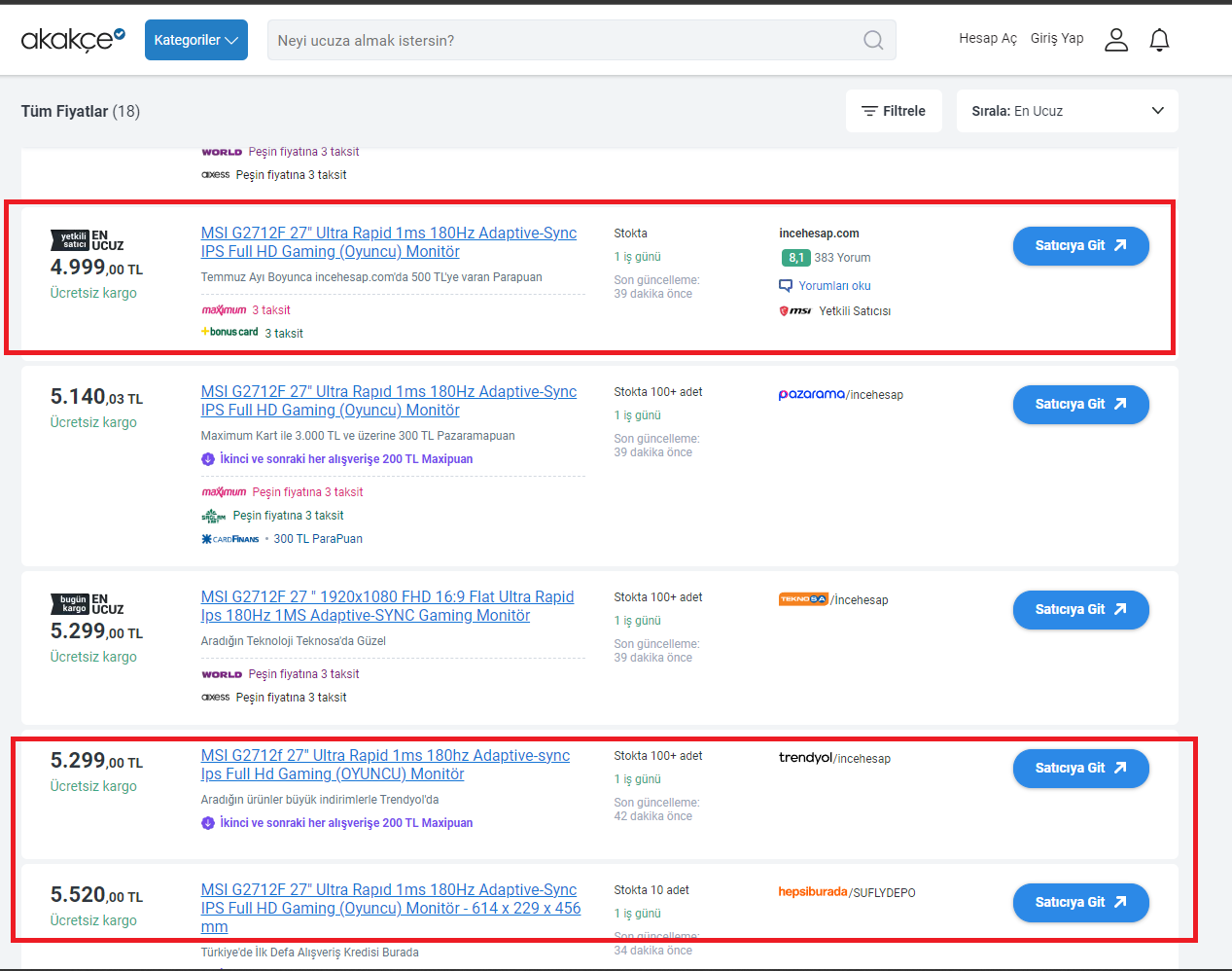 Herkese merhaba. Ben MSI G2712F monitörünü almaya karar verdim fakat işaretlediğim siteler arasında fiyat farkı güvenilirliklerine rağmen yüksek. Sizce neden ve ben en üsttekini alınır mı?