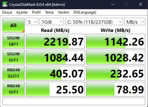 Merhaba,şu an bilgisayarda bulunan SSD THNSN5256GPU7 Toshiba 256,0 GB yaklaşık olarak aldığım değerler disk mark üzerinden bu şekilkde çıktı.Kullandığım M2 SSD dediğim gibi indirme yaparken 75mbps leri gördüm 50 ye kadar düşüyor HDD de durum vahim 20 30 lar ortalama indirme hızı aslında ben bunun için SSD almak istiyorum aklımda Samsung 970 Evo Plus var hocam ama 1k da biraz pahalı geldi,büyük ihtimal değer ama pahalı,alternatiflere de bakacağım hala bekliyorum önerilerinizi.