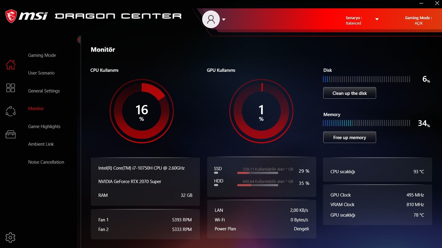 MSI GE-75 9SF modelinde oyuncu bilgisayarım var. İlk aldığımda her şey süperdi sessiz sedasız çalışıyordu. Oyunlarda orta bir ses seviyesi varken son 1 aydır fanların devir seviyesi boştayken bile gereksiz fazla -2 fan da 4000 RPM seviyelerinde- dolayısıyla bir hayli sesli. CPU oyunlarda 94-95 derecelerde çalışıyor. GPU ise oyunlarda 85 derecelerde oluyor.