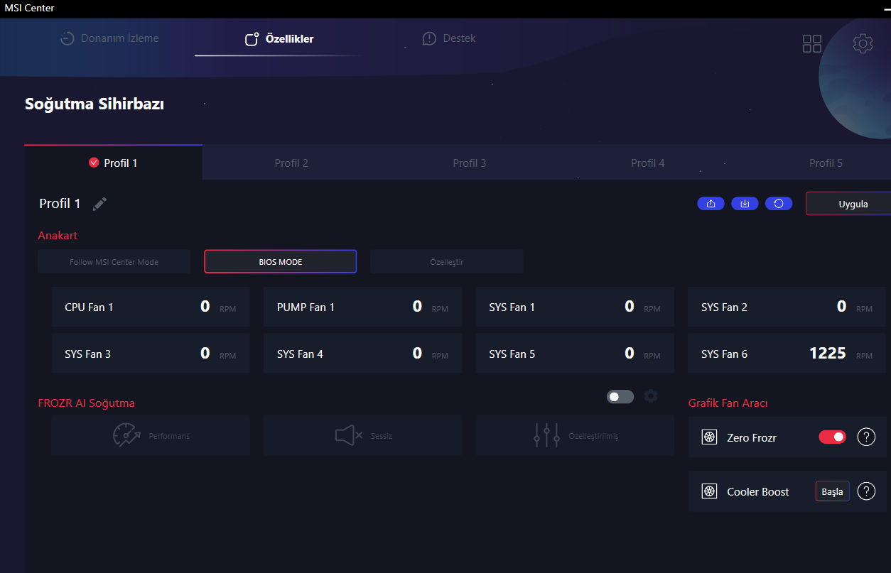 Gerçekleştiremedim derken yanlış anlaşılma olmasın. Kasadaki tüm fanlar işlemci fanı dahil olmak üzere çalışıyor. Bilgisayarı monte ederken her ne kadar elimden geldiği kadar gerekli kabloları kullanım kılavuzunda gözüken talimatlara uygun olarak bağlamaya çalıştıysam da yine de görüldüğü gibi bir problem mevcut. Çünkü fanlar dönüyor olmasına rağmen MSI Center'da 0 RPM olarak gözüküyor. Muhtemelen bu problemden dolayı da kasada bulunan fanların hız kontrolü benim elimde değil. Kasada bulunan tüm fanların anakarta benim yazılım üzerinden kontrol edebileceğim şekilde nasıl kablo ile bağlanabileceğini gösteren bir rehber mevcut mudur acaba? İnternette aradığımda belli başlı rehberler var ama kasa fanlarının ne şekilde anakarta takılacağı ile ilgili ayrıntılı bilgi yok. Bundan dolayı da kafam karışıyor.