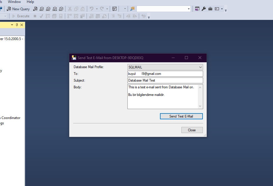 Database mail ayarlarını yaptım. Gmail'de yönlendirme IMAP etkin. Fakat SQL ile mail göndermiyor. Resimleri adım adım paylaştım aşağıda. Saatleridr bana kafayı yedirtti. Başka ne yapmam gerekiyor? İşin içinden çıkamadım. Yeni Gmail açtım onda da yok.