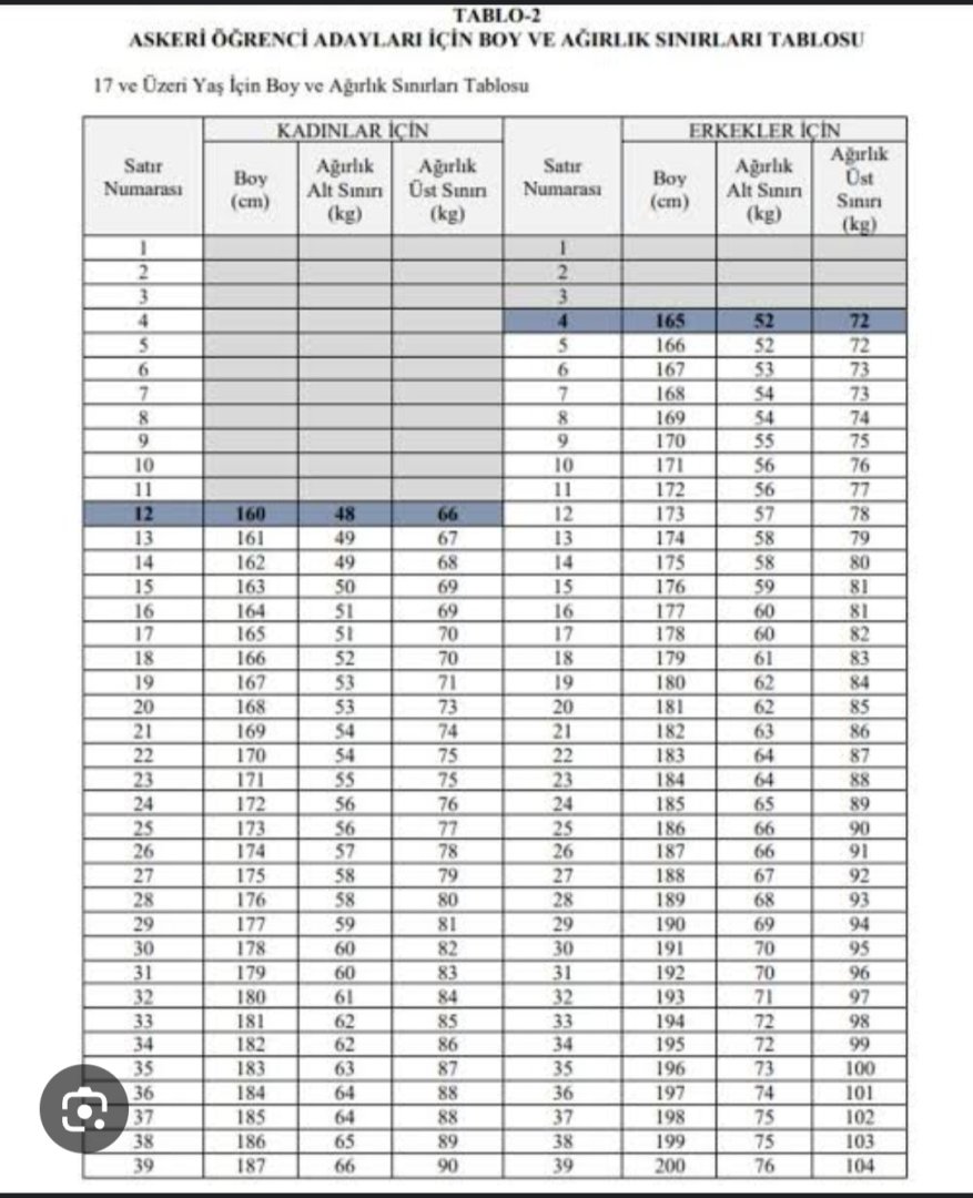 İnternet siteleri önemli değil. Bu MSÜ'nün kendi paylaştığı aynı zamanda kensi sitesinde de bulunan boy kilo endeksi. Ve boy kilo konusunda kesinlikle taviz vermiyorlar 1kilo eksik veya fazla çıkarsan elenirsin. Göz derecen olaki 1 çıkarsa geçersin.