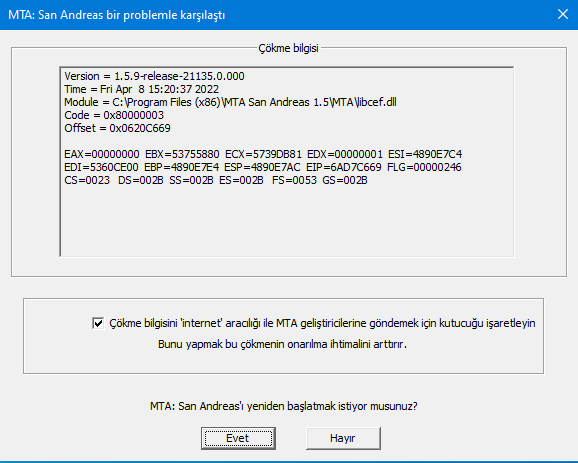 MTA: San Andreas'ı açtığımdan 2-3 dakika sonra hata raporu aldım.