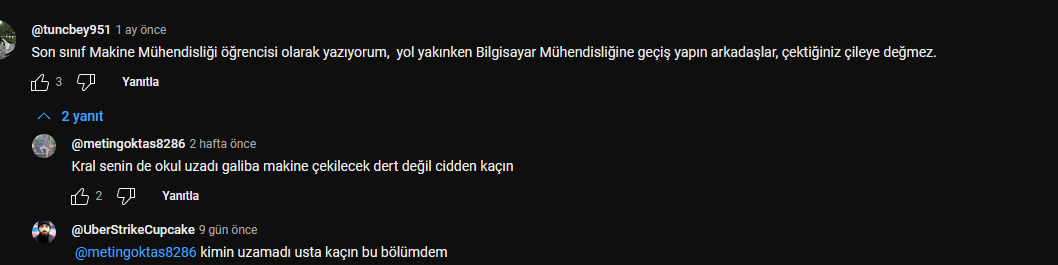 @ErayDq şuan istediğin mesleği bulamamış olmakta haklısın çünkü henüz pek deneyimin yok diye düşünüyorum. İş bulamama konusunda diyebileceğim bir şey yok Türkiye'de yaşıyoruz her şey olabilir. Çevrende bu dediğin alanlarda çalışan insanlarla git görüş onlar nasıl memnun mu, gerçekten sana göre uygun bir sektör mü öğrenmiş olursun. Eğer böyle bir tanıdığım yok diyorsan kariyer etkinlikleri oluyor (bilmiyorum liselerde hâlâ yapılıyor mu) onlara katıl, online olarak da olsa ilgi duyduğun alanlardaki insanlara ulaş yorumlarını al diyebilirim. Aile baskısı ile sırf okumuş olmak için okumak çok kötü bir şey, elbette senin iyiliğini isterler ancak onların görüşü ile seninki farklı olabilir. Psikolog olabilecek bir adamın mühendislikle vakit kaybetmemesi gerektiğini düşünüyorum.