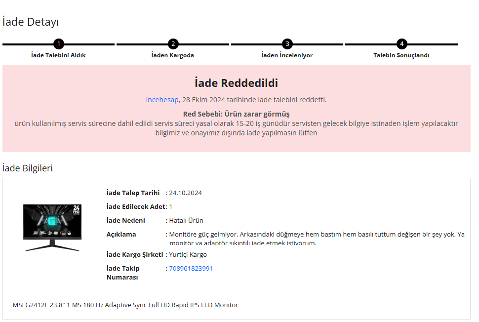 Monitörü elime geçtiği gün iade talebi oluşturdum çünkü monitör dümdüz çalışmıyordu. Ne güç geliyor ne ışığı yanıyordu. Paketledim Yurtiçi Kargo şubesine bıraktım. Nasıl bir yol izlemeliyim?