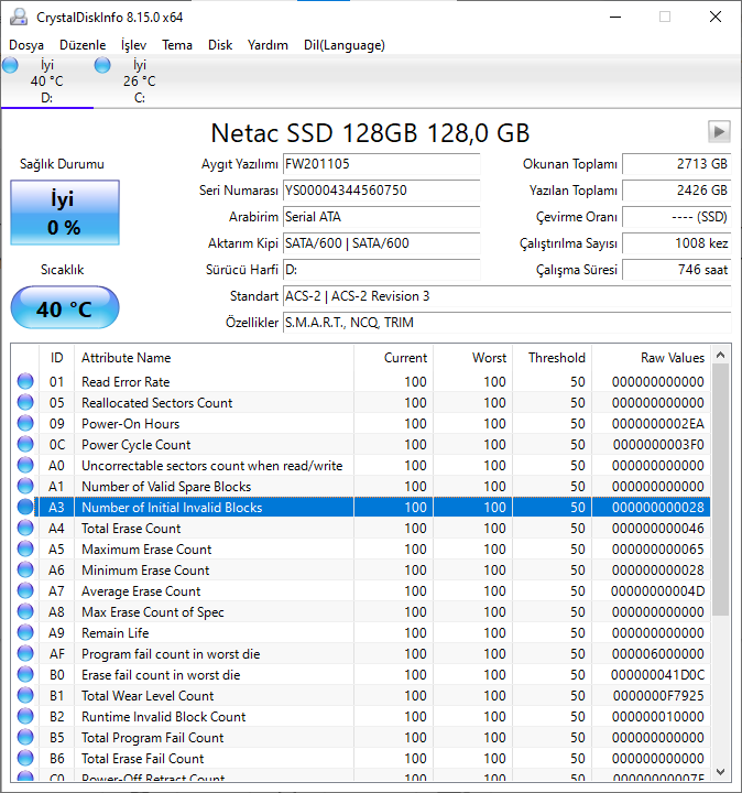 Merhabalar, 4-5 ay önce laptopuma SSD takıldı daha öncesinde HDD'de Windows sorunsuz çalışıyordu ancak SSD takıldıktan 1 ay sonra Windows sürücü, mavi ekran hataları falan vermeye başladı. Hata sıklığı gitgide arttı CMD'den "SFC /scannow" komutlarıyla kısa süreliğine düzeltim ama belli bir yerden sonra formatlamak zorunda kaldım 6-7 civarı format attım ama düzelmedi bilgisayarcıya götürdüğümde Windows'un 1803 sürümünü yüklemişler o sürümdeyken hata vermedi ama 2 hafta sonra Windows kendini oto olarak 20H2 sürümüne güncelledi hatalar yine çıkmaya başladı şu an HDD'de 21H1 sürümünü kullanıyorum herhangi bir sorunla karşılaşmadım. Sorunun SSD'de olduğunu düşünüyorum Smart verileri görsellerde var tam emin olamadım değerler nasıl, sizce hata almam normal mi? Tecrübesi olan anlayan biri yardımcı olabilir mi?