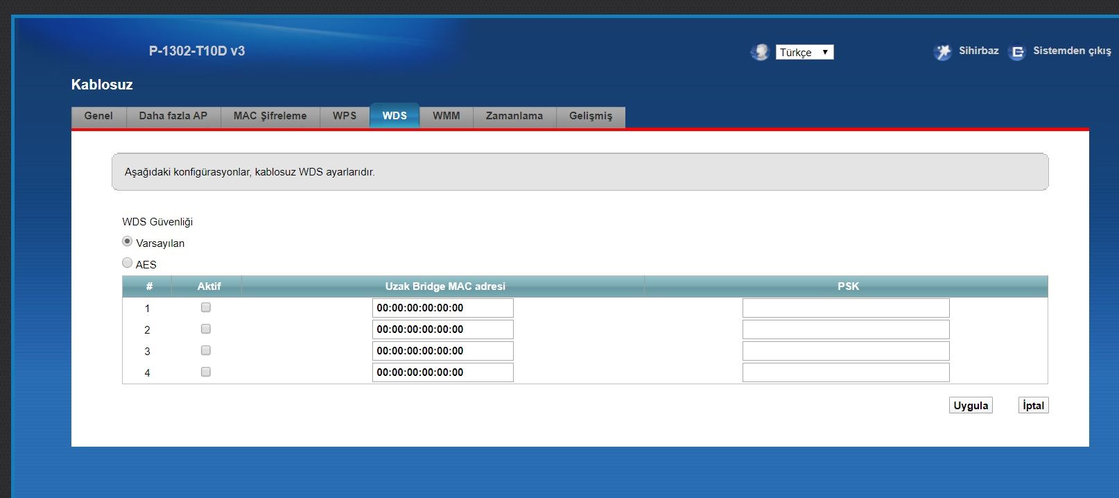 ZyXEL modem ikincil olursa bu özellik işimize yaramıyor. Ana modem olarak kullanılırsa WDS özelliğini kullanmanız gerekiyor. MESH özelliği olmayan modemleri ikincil modem olarak kullanıp kablosuz köprüleme yapabileni görmedim. İlla ki olmaz demiyorum ancak yapılabildiğini görmedim. Varsa bir yöntem tarif edin, biz de öğrenelim :)