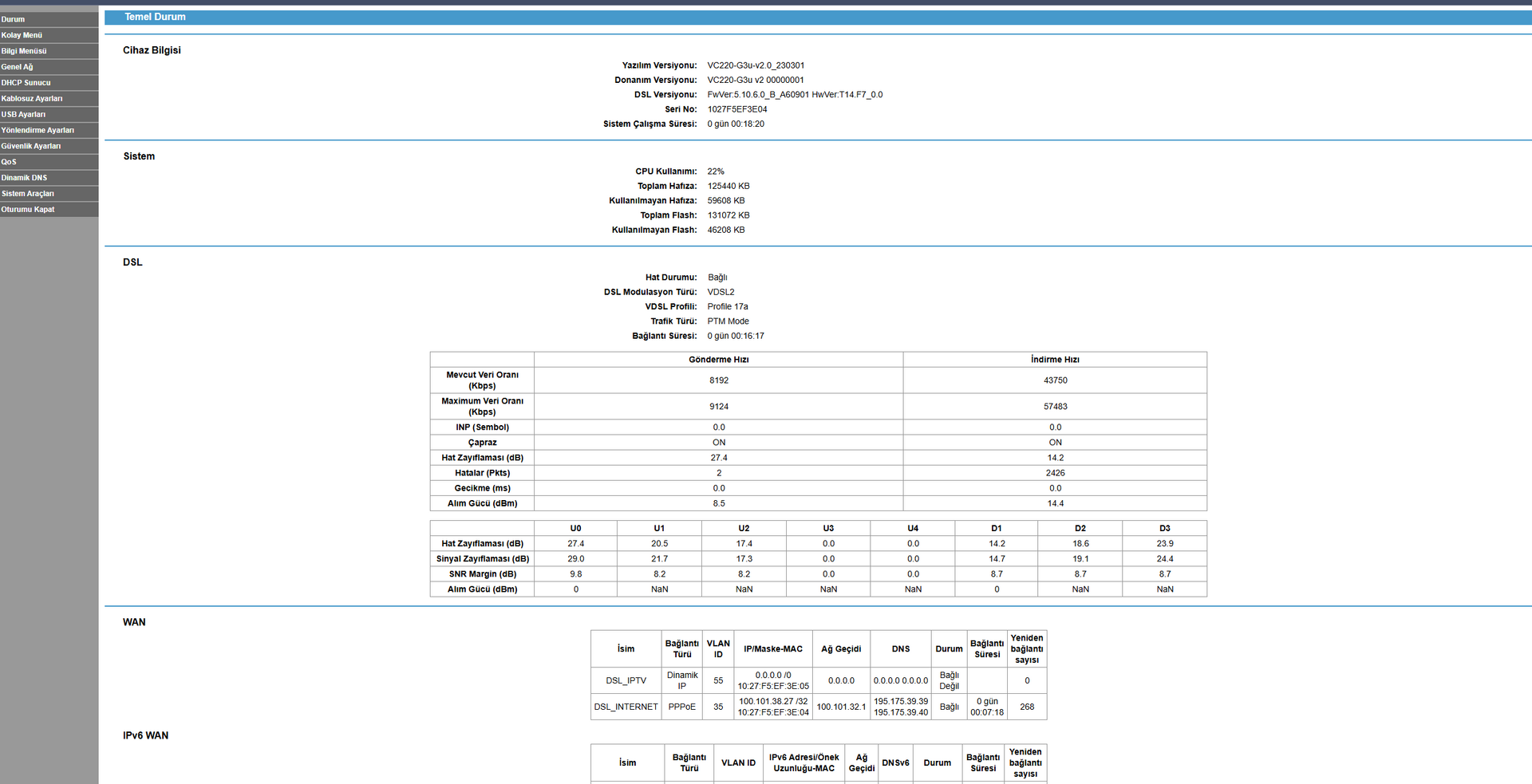 Hat değerleri ve internet hız testi aşağıda ki gibi;