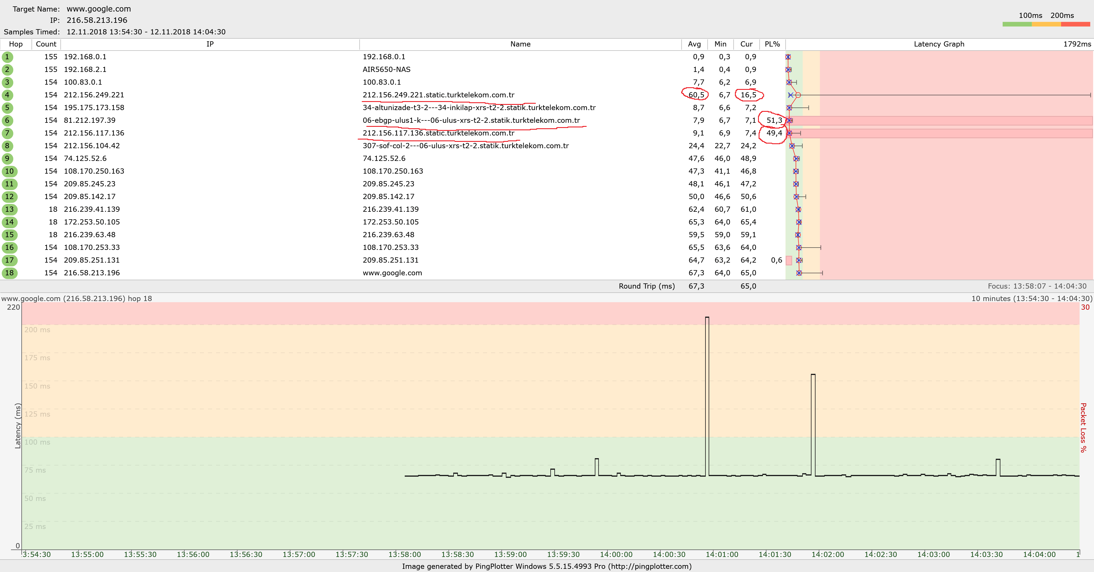 Buyrun bakın ben kullanırken durum resimlerde göründüğü şekilde içler acısı idi. Aboneliğimi iptal ettirdikten sonra tekrar bağlattım Ankara'da başka bir yerde tekrar denemek için, orada da durum aynı idi. Bu kadar packet loss varken ne bir oyun oynayabiliyorsunuz, ne bir arkadaşınızla discord'da konuşabiliyorsunuz ne bir canlı yayın izleyebiliyorsunuz. Seçim sizin. Diğer forumlarda da Ankara civarında Netspeed kullanıp durumu aynı olan çok insan var. Çözüm bekliyorlar ama daha çok beklerler. Teknik arkadaşlar çözemeyiz diyorlar çünkü sorun yaşanılan hoplardaki cihazlar Netspeed'in değil, Türk Telekom'un. Ben başka bir sağlayıcıya geçtiğimde packet loss sorunu bitti çünkü bağlanılan omurga ve hop'lar daha başka.