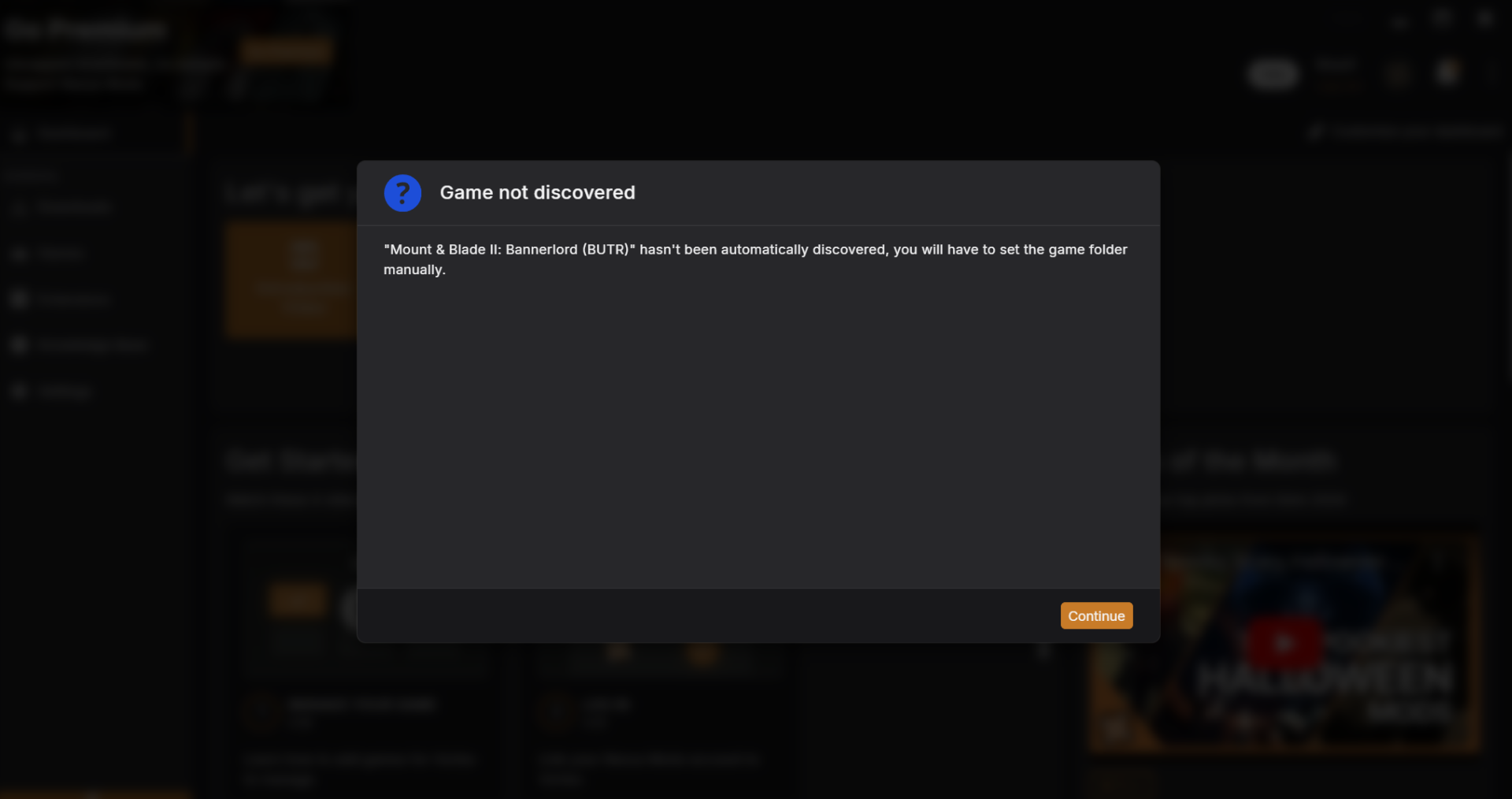 Nexus üzerinden Bannerlord için modlar kurmaya çalışıyorum. Modları manuel olarak yüklemekte zorluk yaşıyorum çünkü oyun sürümü ile uyumluluk sorunları ya da .dll hataları var, bu yüzden Vortex kullanmaya karar verdim. Vortex'i kurdum ve "manage" butonuna tıklayarak Bannerlord'u ekledim, ancak bir uyarı aldım (bir ekran görüntüsünü ekledim). "Mount Blade Bannerlord (butr)" bulamadığını söylüyor. Bannerlord klasörünün konumunu kendim manuel olarak seçtim.