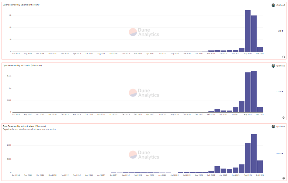 - En çok alım satımın yapıldığı NFT pazar yeri olan OpenSea sitesinin 2021 Ağustos ayı ticaret hacmi 3.4 milyar $. Temmuz 2021'de ise bu sayı 325 milyon $ idi. 1 ayda %1000'lik bir artış demek bu. Ek olarak, Ağustos ayında OpenSea platformu aracılığıyla 1.6 milyon adet NFT satışı oldu.