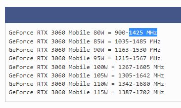 Laptop 3060 ekran kartlarının watt değerlerine göre MHz değerleri: